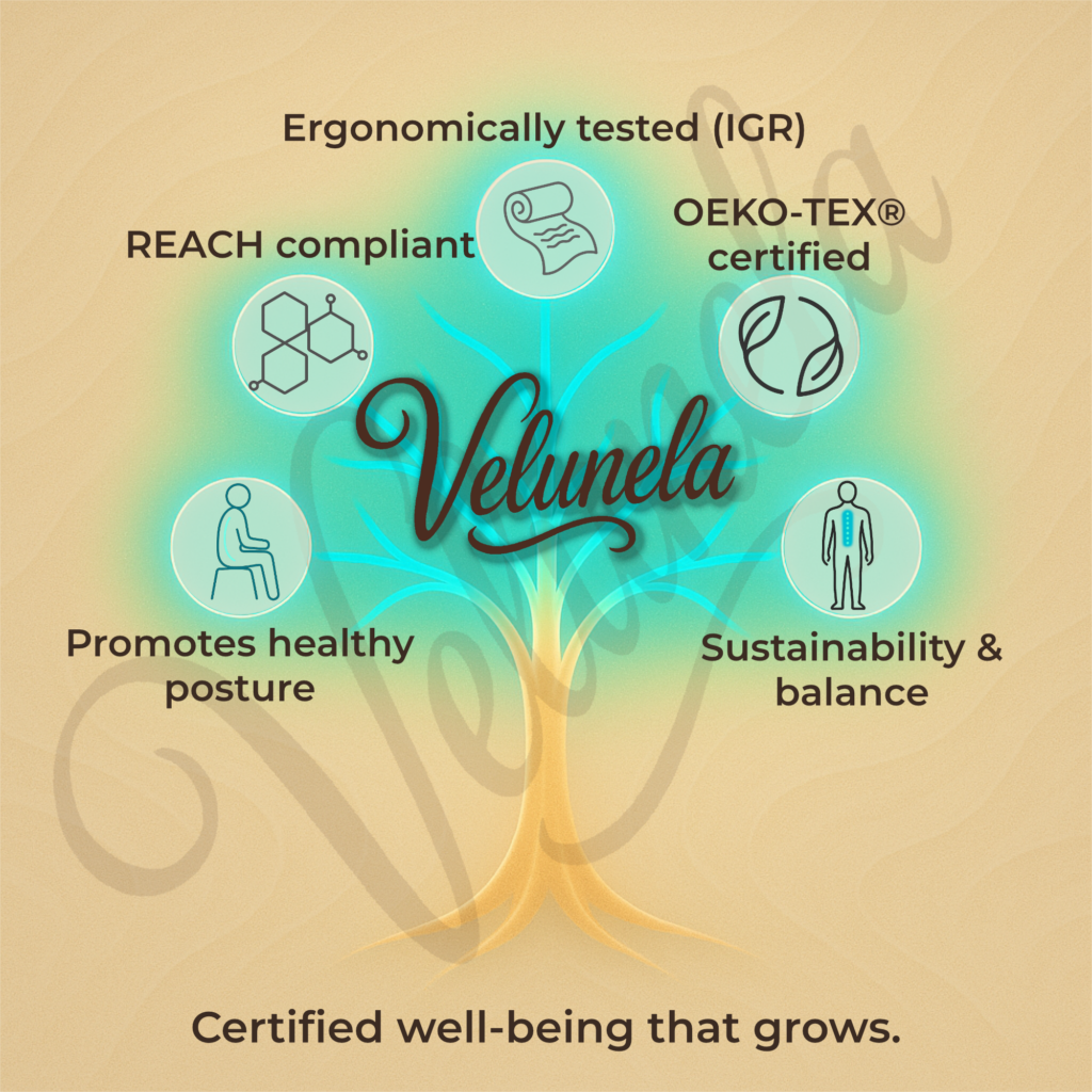 Trust through transparency: Velunela does not stand for empty quality promises, but for verifiable testing, tested materials, and responsible manufacturing. We know that trust is not created through advertising slogans – but through facts, openness, and consistency. That is why every Velunela seat cushion is designed so that you can clearly understand what it is made of, how it works, and what has been tested.