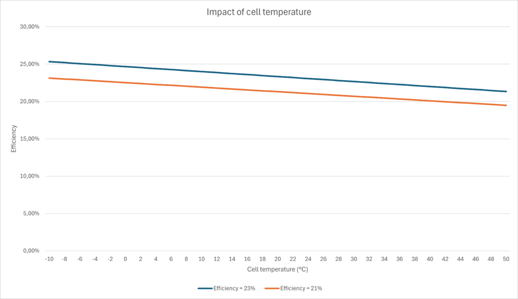 - In summer, cell temperatures above 60 °C can occur, reducing efficiency by several percent.